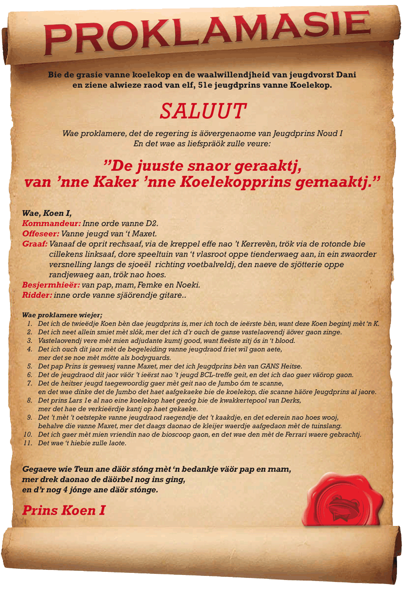 Zunjig 5 jannewarie waerdje oze nuje Jeugdprins oetgerope. Naodet de Raod van Elf Jeugdprins Noud I thoes haaj opgehaoldj, ging de hieële meute ónger leiding vanne Borekepèl richting Kwakkertepool. Uiteraad waas 't ieërste, en det waas ouch geliek zien letste as Jeugdprins, waord väör Noud, dae op gepasje wijze aafsjied noom. Wieë alle offisjiele plichtplegingen achter de rök wore, waas 't hoeëg tied väör de nuje Jeugdprins. Naodet de spanning good waas opgebouwdj kwoom Koen Schroijen nao väöre as nuje Jeugdprins. Koen I, zoon van Roul en Monique Schroijen en broor van Femke zal de Koelekop dit jaor aanveure.