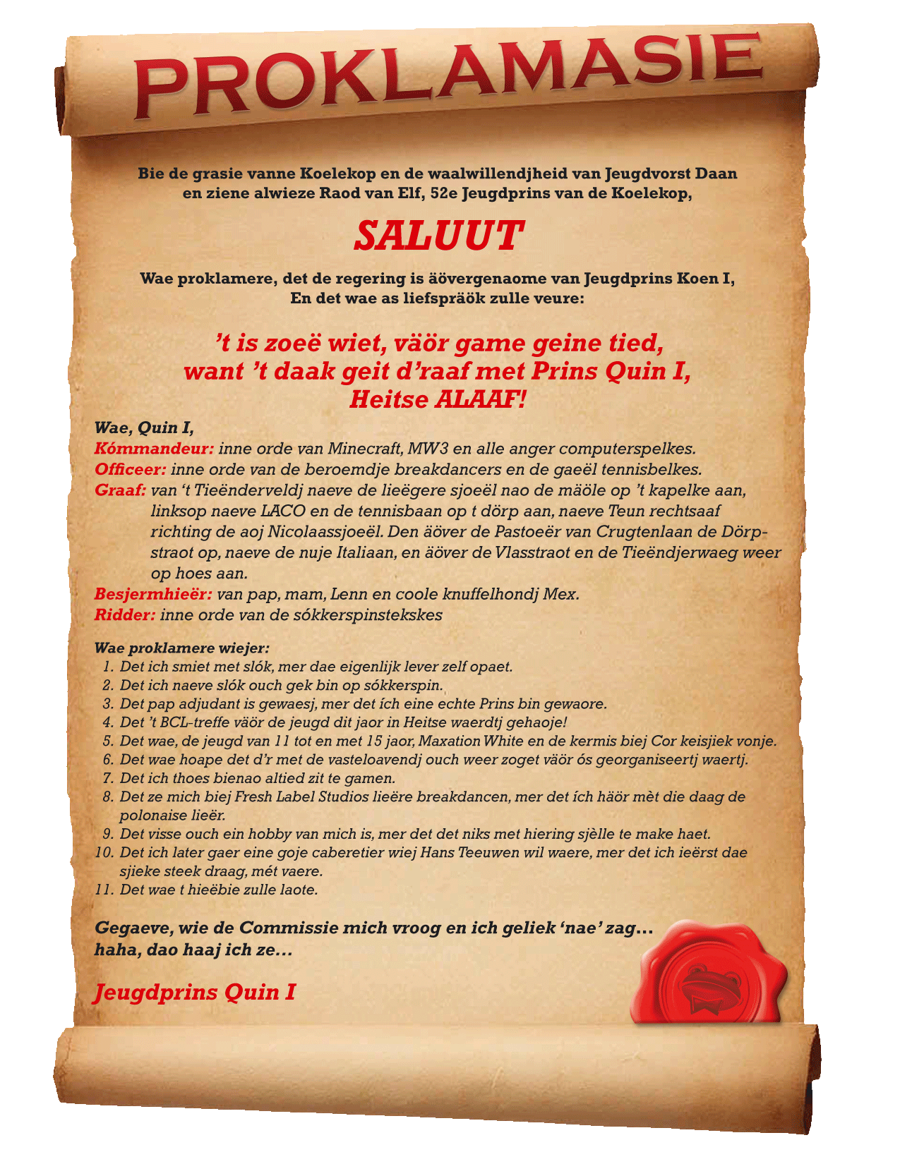 Jeugdprins Quin I zal äöver de Koeleköpkes regere mèt ziene liefspreuk " 'T is zoeë wiet, väör game geine tied, want 't daak geit d'raaf met Prins Quin I, Heitse ALAAF".