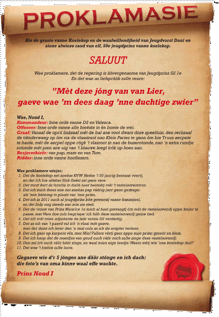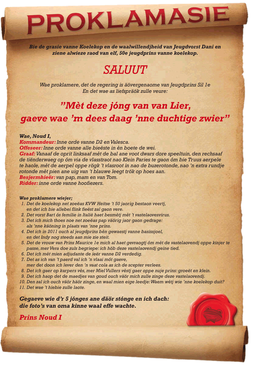 Op zunjig 6 jannewarie waerdje in eine bomvolle Kwakkertepool neet allein de nuje Jeugdprins vanne Koelekop oet Heitse oetgerope. Nae! Ouch waerdje d'r eine compleet nuje Jeugdraod en eine nuje Vorst gepresenteerdj. Eine sjoeëne groep frisse, jóng hunj die väörop gaon gedorendje de vastelaovendj. Allerieërst waerdje d'r eine nuje Vorst geïnstalleerdj. Dani Raemakers zal de komendje twieë jaor de Prins biestaon. Nao de installatie van Dani waas 't groeëte moment dao. Noud van Lier, oftewaal Noud I, waerdje gepresenteerdj as de nuje Jeugdprins vanne Koelekop. Noud is de jóngste zoon van Joep en Hetty van Lier en broor van Tom. Gein onbekindje femilie inne vastelaoves-scene van Heitse. Joep waas vaorig jaor groeëte Prins vanne Kwakkert en Tom was ein paar jaor geleje adjudant vanne Jeugdprins. Noud kumptj dus oet ein good nèst. Daonao stèldje Noud zeen adjudante väör, Rik Peters en Joost Winkelmolen. En "last but not least" elf nuje raodsleje.