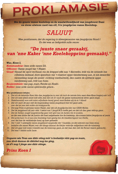 Same mèt Jeugdvorst Dani en zien adjudante Giel Seunis en Martijn Frenken doordje 't neet lang, enne Kwakkertepool sting oppe kop. Ónger ziene liefspreuk "De juuste snaor geraaktje, van eine Kaker eine Koelekopprins gemaaktj", zulle wae Koen dit jaor good lieëre kinne.