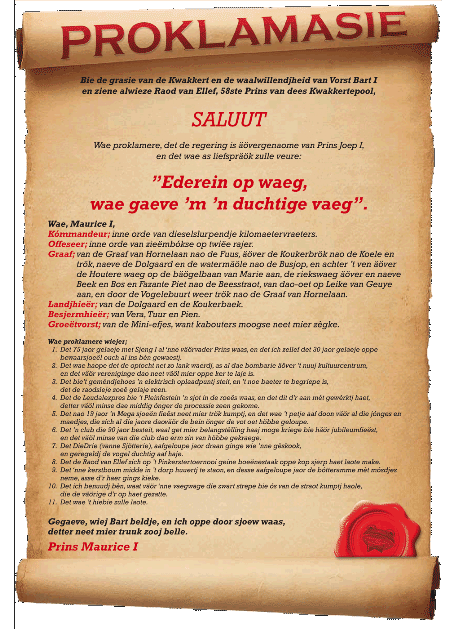 Op ein magische spectaculaire meneer kwoom Joep I teväörsjien as nuje Prins. Joep I zal same mèt zien vrouw Hetty, zien wichter Tom en Noud en twieë adjudante, Lou Pouls en Emiel Vullers 't komendje jaor regere äöver 't Kwakkerteriek.